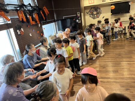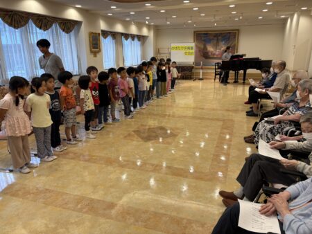TOP > ブログ > メルシー、まごのてあんに行きました メルシー、まごのてあんに行きました 今日きりんぐみの子どもたちが老人ホームメルシー緑ヶ丘とデイサービスのまごのて庵にお邪魔してきました。おじいちゃんおばあちゃんと一緒に歌を歌ったり、お喋りしたりと楽しいひと時を過ごしました。 2025.09.25 ブログ