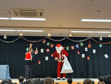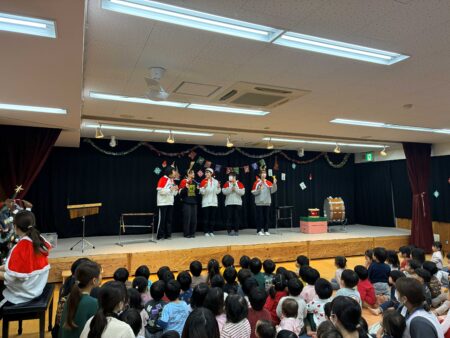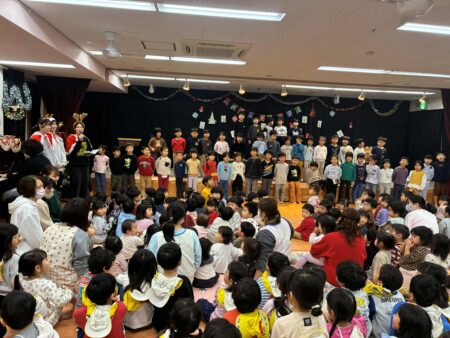 今日はみんなが楽しみにしていたクリスマス会がホールでありました。きりんさんの歌・先生たちのクリスマスソングの合奏から始まり、ペープサートで大盛り上がりしたところで待ちに待ったサンタさん登場!!みんな歓声をあげて大喜びでしたよ。クリスマスプレゼントも一人一人もらって子どもたちの笑顔あふれる一日でした。